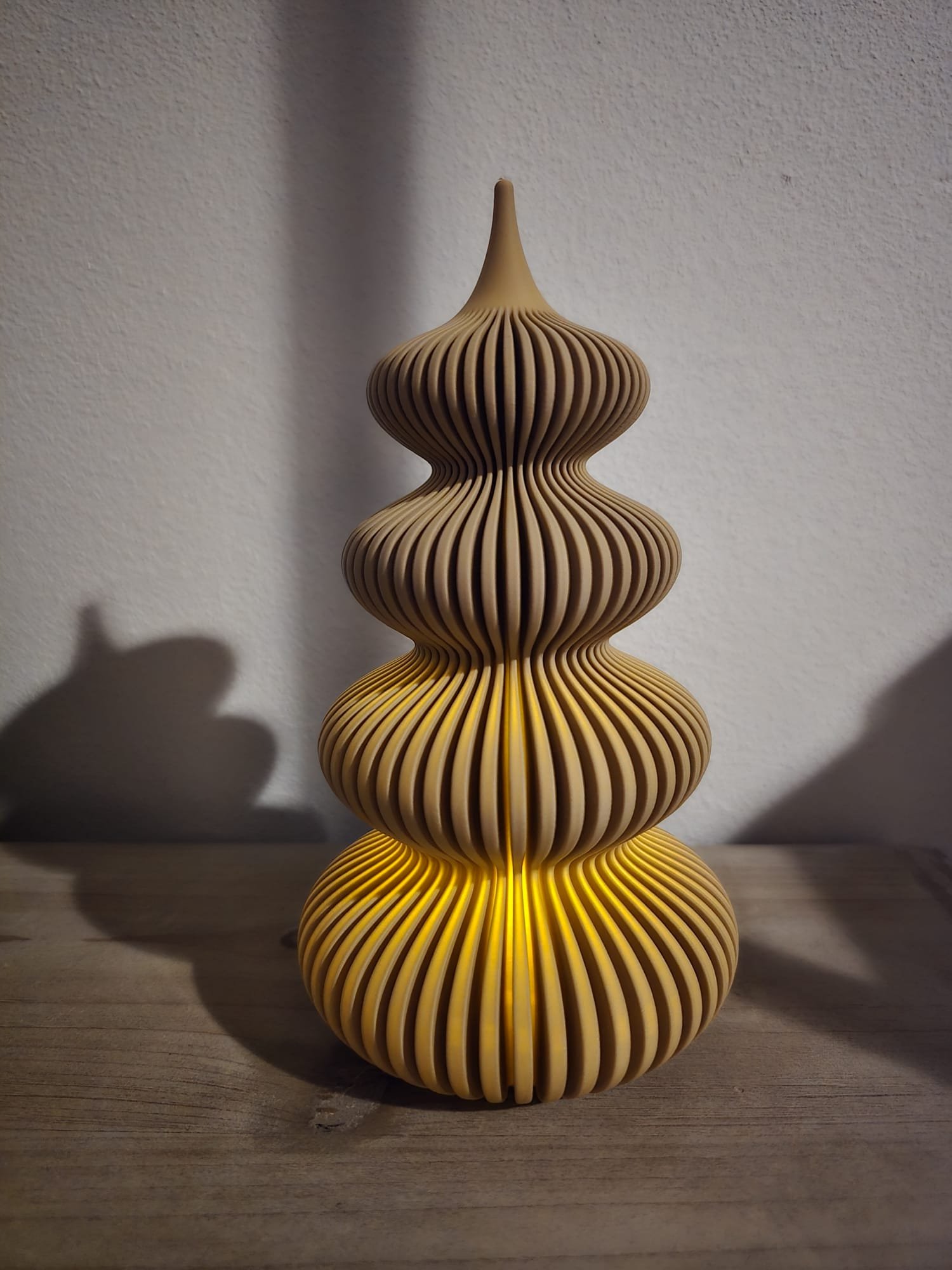 Ontdek de perfecte aanvulling voor jouw decoratiecollectie: de prachtige kerstboom met curves en verticale strepen. Dit unieke ontwerp brengt verfijning en elegantie in elk interieur. Dankzij de subtiele lichtdoorlatendheid, afhankelijk van kleur en omgeving, creëer je een warme en uitnodigende sfeer in jouw ruimte. Of je nu een moderne of klassieke stijl hebt, deze kerstboom past perfect bij jouw decoratiewensen.