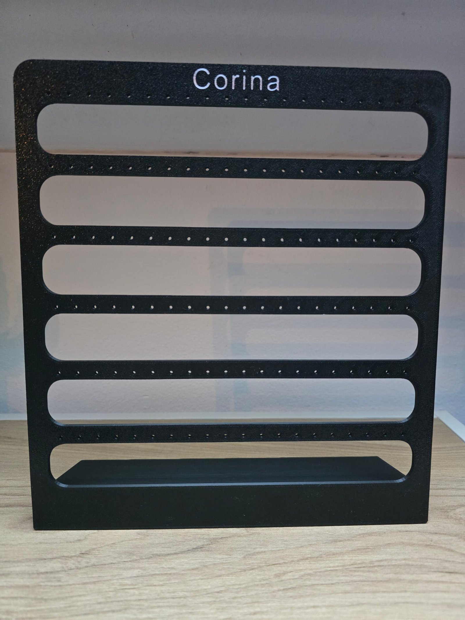 De zwarte oorbellenstandaard biedt de optie om je naam te personaliseren, waardoor je een unieke touch toevoegt aan je accessoires. Kies uit een breed palet van kleuren om jouw standaard aan te passen aan jouw persoonlijke smaak, geïnspireerd door de stijlvolle tinten van onze andere producten. Of je nu kiest voor een subtiele uitstraling of een opvallend ontwerp, de combinatie van het zwarte materiaal met je gepersonaliseerde details maakt deze standaard een echt uniek product.