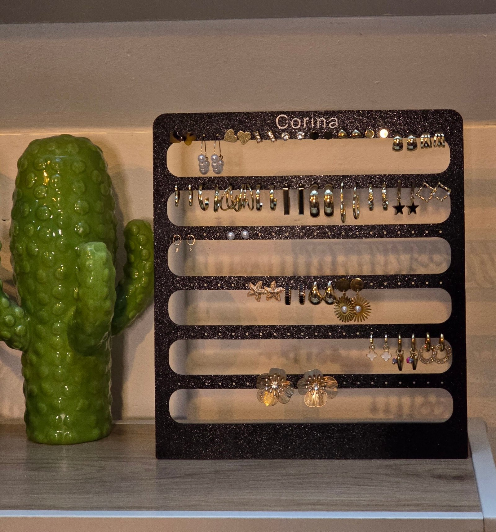 Met deze zwarte oorbellenstandaard krijg je een combinatie van functionaliteit, stijl én een persoonlijke touch. Maak jouw sieradenopbergervaring nog magischer met deze bijzondere accessoire!